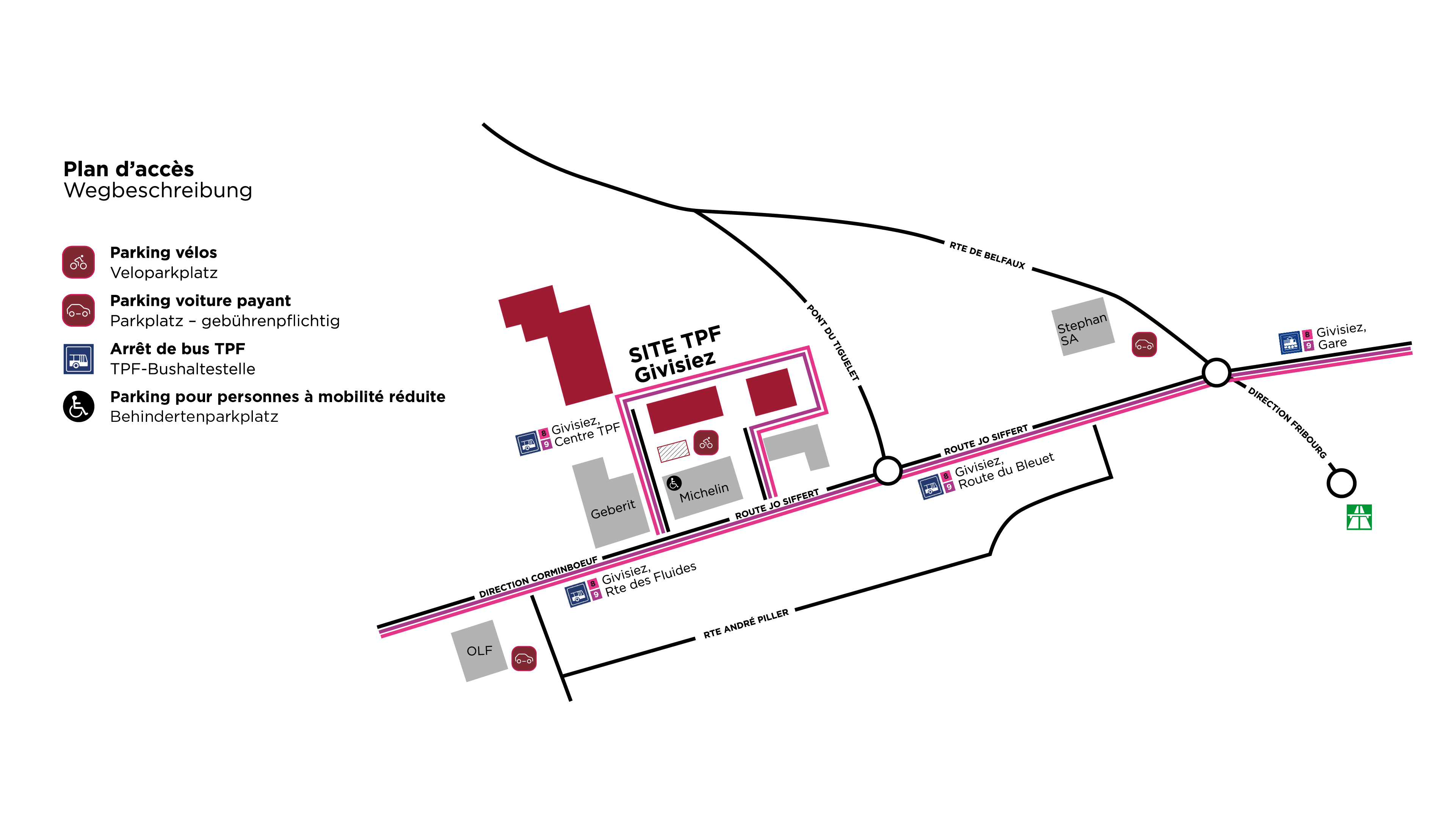 Les lignes 8 et 9 sont déviées par l’arrêt Givisiez, Centre TPF et vous emmènent au cœur de la manifestation. Ligne 8*